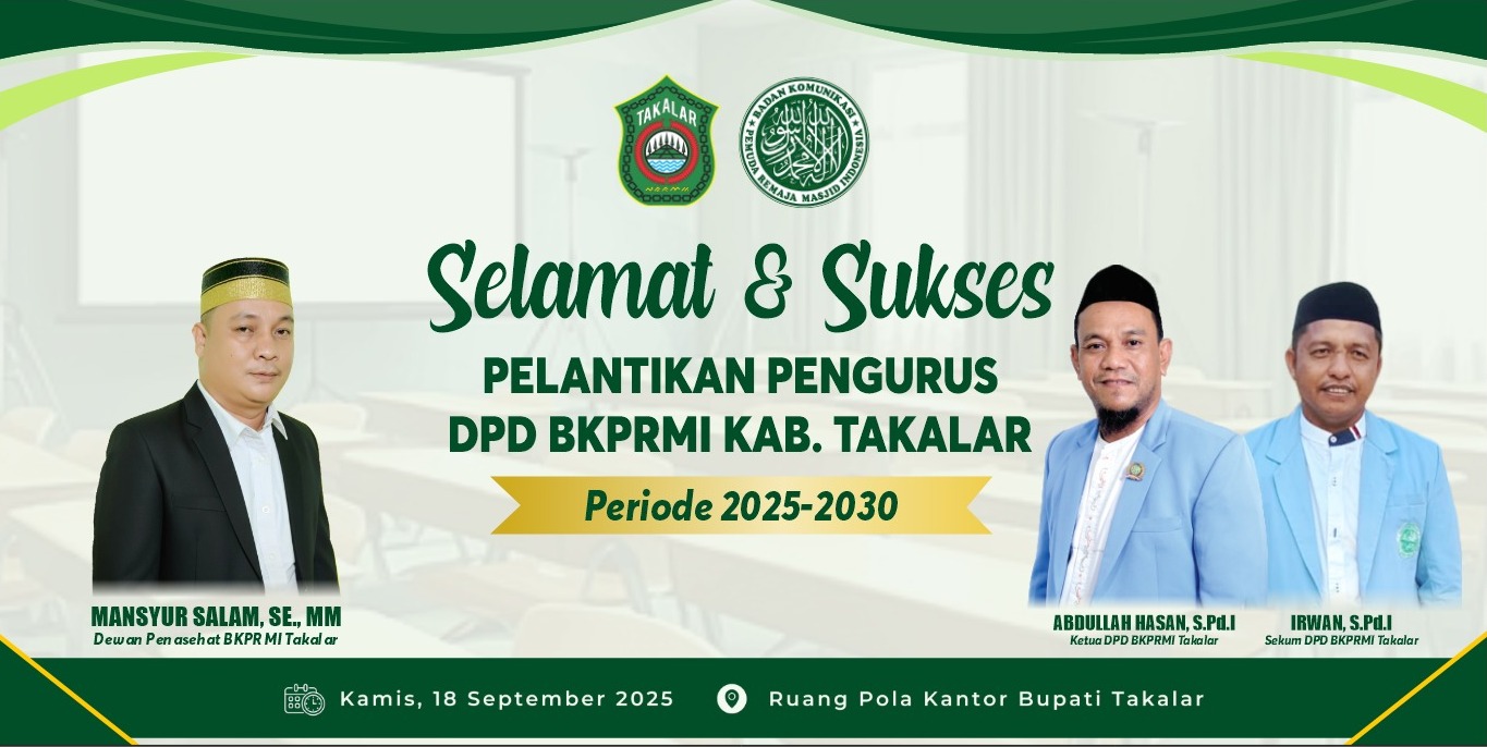 Takalar 18/9/2025 bertempat di ruang pola kantor Bupati Takalar Pengurus BKPRMI Kabupaten Takalar periode 2025-2030 dilantik oleh pengurus wilayah dan dihadiri Bupati dan wakil Takalar.